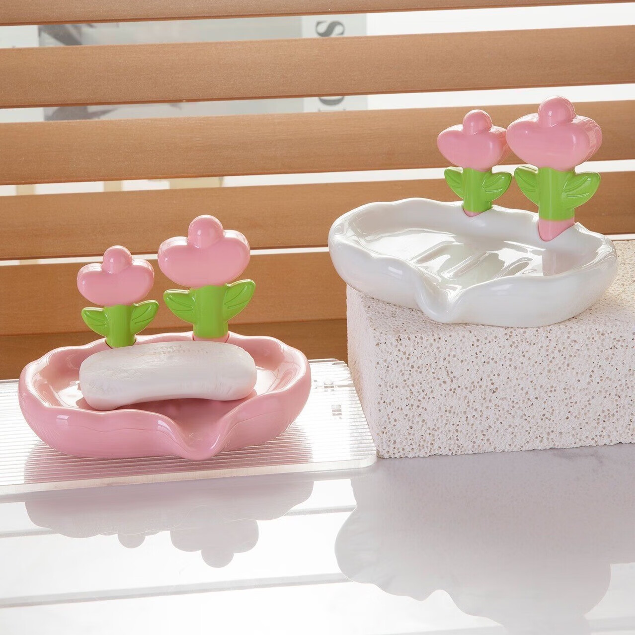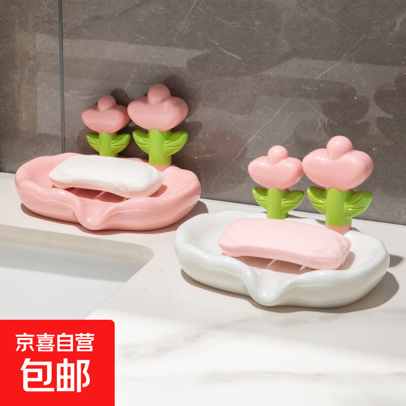 奢沥水肥皂盒创意免打孔家用花朵香皂盒洗手台皂碟高档收纳 创意郁金香肥皂盒 【粉色1个】