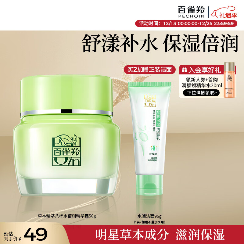 百雀羚(PECHOIN)草本精萃八杯水倍润精华霜50g补水保湿面霜品质国货圣诞礼物