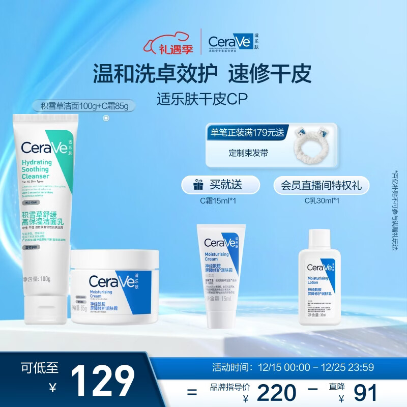 适乐肤(CeraVe)【干皮CP】积雪草洁面100g+C霜85g(补水保湿洗面奶面霜男女士)