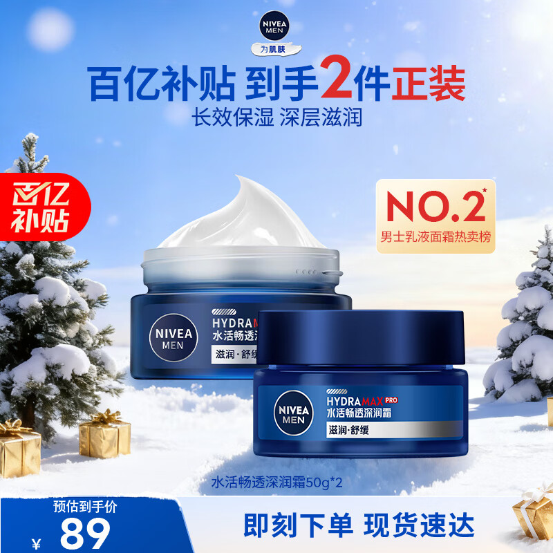 妮维雅(NIVEA)男士【深层滋润】补水保湿水活畅透深润霜50g*2清爽润肤面霜