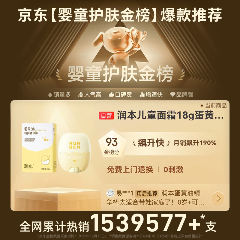 润本(RUNBEN)儿童面霜婴儿蛋黄油皴裂棒宝宝秋冬滋润保湿霜身体乳补水润肤乳 蛋黄油面霜棒 18g 【王牌爆款】