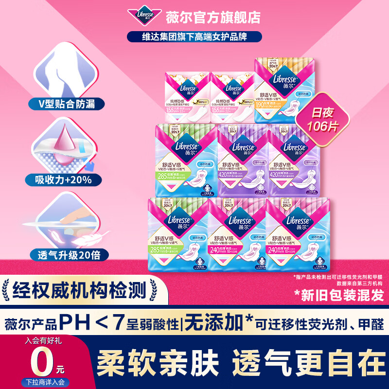 薇尔卫生巾日夜组合套装日用加长夜用护垫迷你巾姨妈巾超薄透气 日夜106片