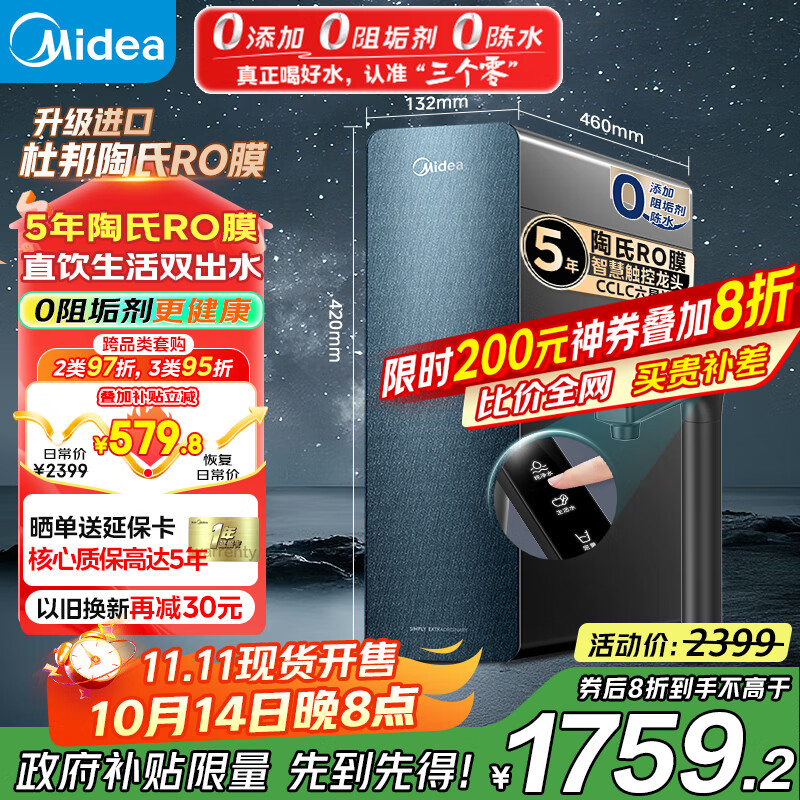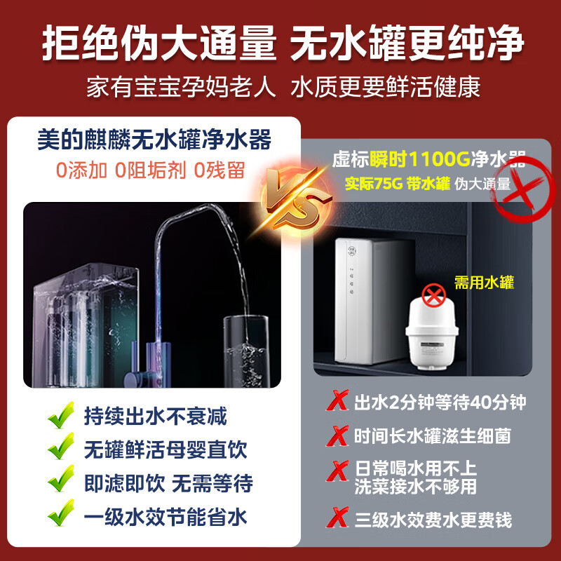 美的(Midea)净水器家用大通量厨下式RO反渗透纯水净饮直饮机前十名麒麟0阻垢剂【国家补贴】无罐鲜活母婴直饮