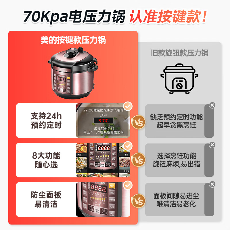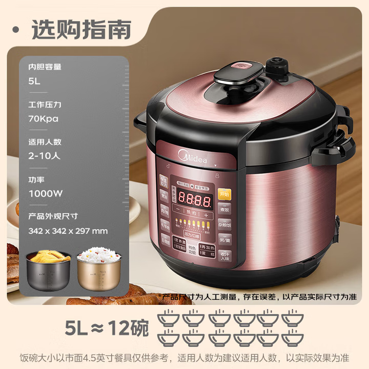 美的(Midea) 电压力锅电高压锅家用大容量多功能定时预约高压电饭煲电饭锅 可煮小米粥2-3-5-8人用 尊享款 行业TOP【4-10人 双胆】 5L
