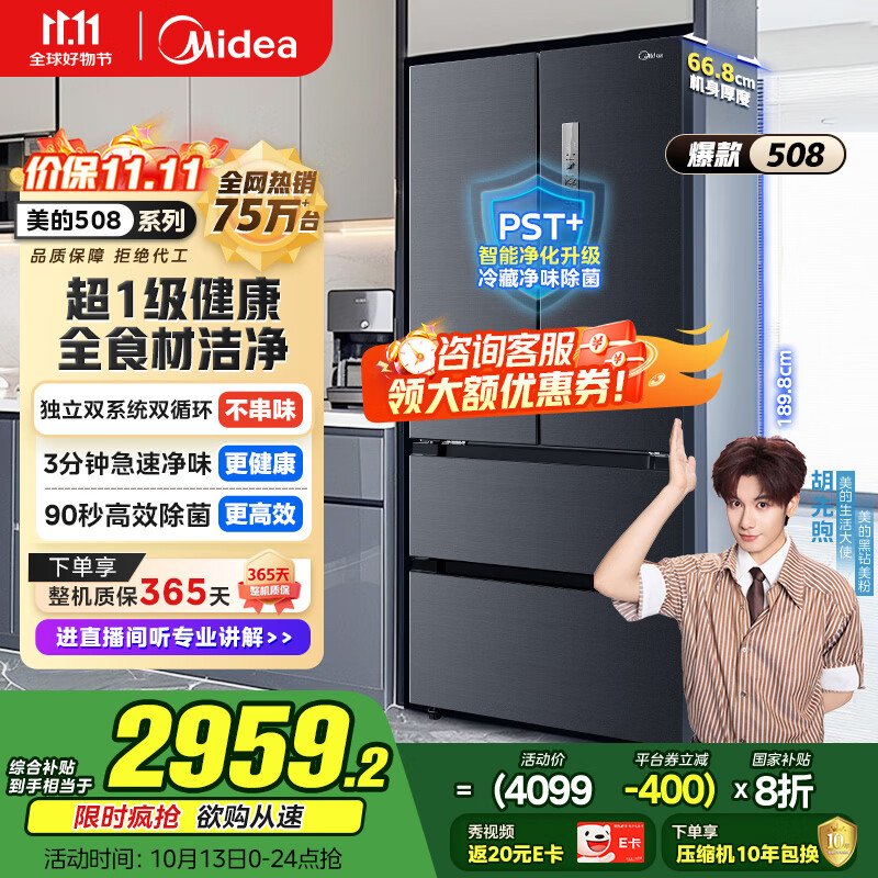 美的(Midea)508升法式多门四开门双系统双循环一级能效除菌净味大容量家用冰箱BCD-508WTPZM(E) 国家补贴20%