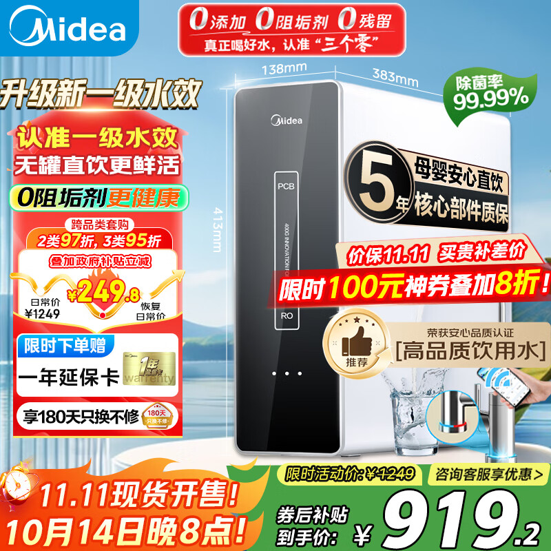 美的(Midea)净水器家用星河1000G PRO 5年长效陶氏RO反渗透0阻垢剂直饮机厨下式净饮机国家补贴 鲜活零陈水