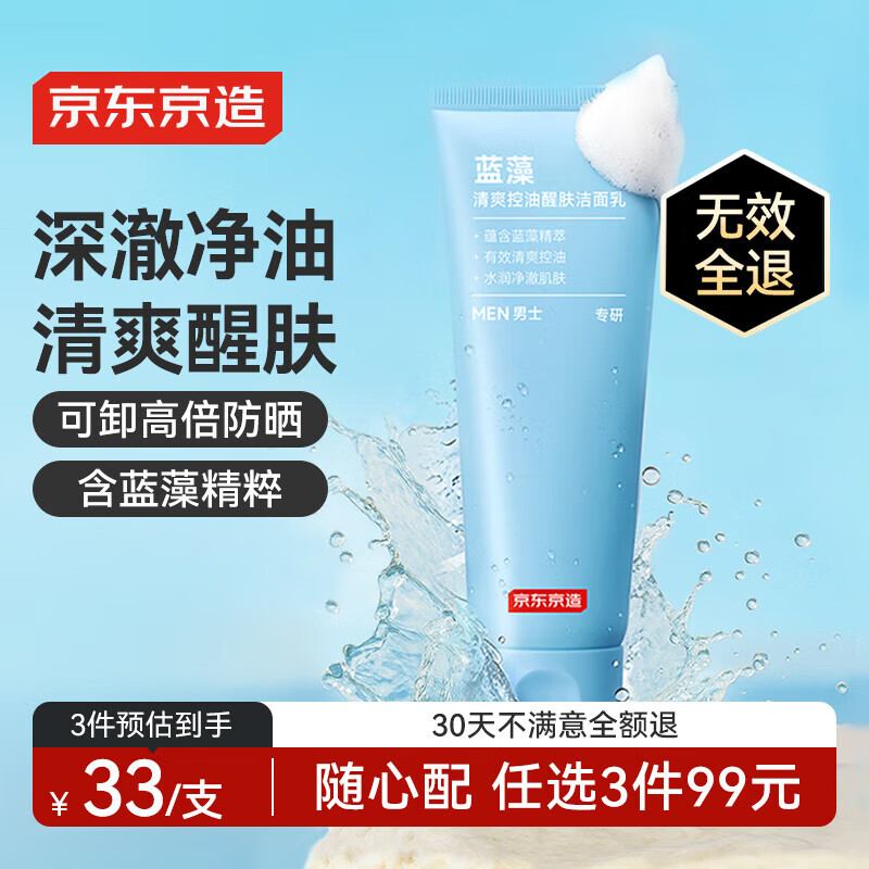 京东京造海蓝藻男士清爽控油醒肤洁面乳100ml氨基酸表活洗面奶