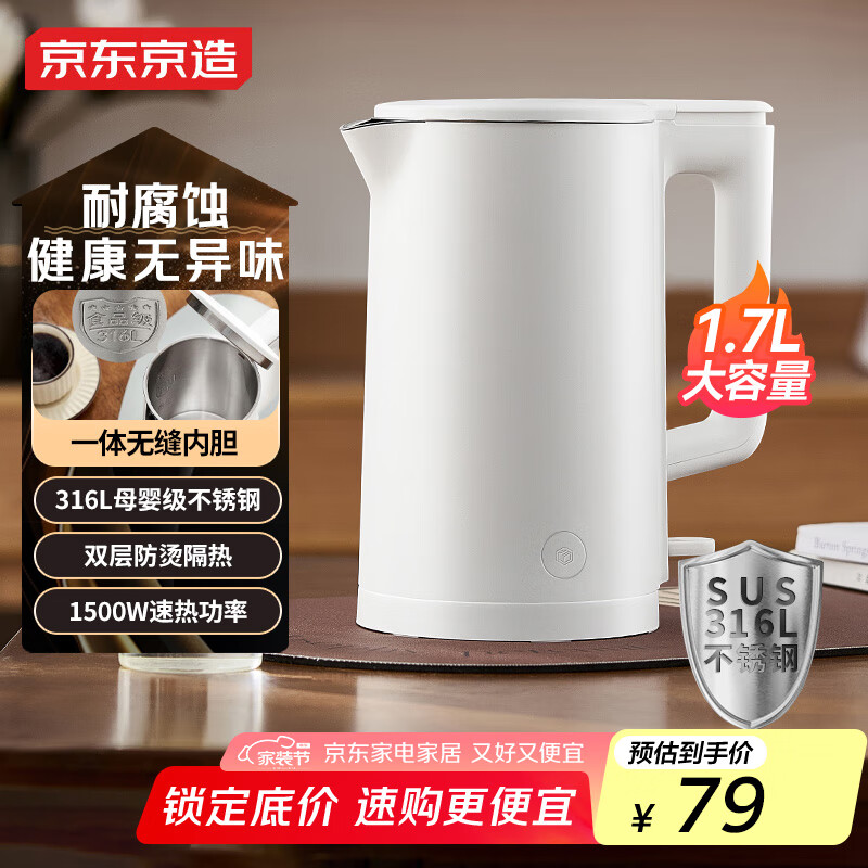 京东京造316L食品级不锈钢烧水壶1.7L 电热水壶 家用电水壶 速热一体无缝内胆食品级热水壶 自动断电