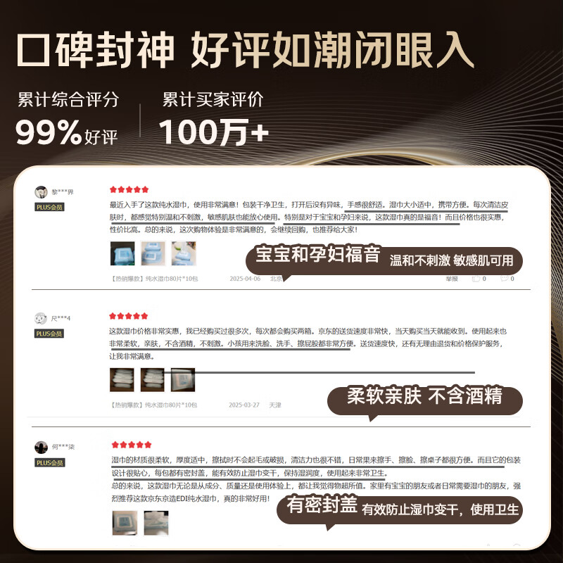 京东京造 EDI纯水湿巾80片*10包 洁肤柔湿纸巾 婴儿湿巾纸 8重过滤温和