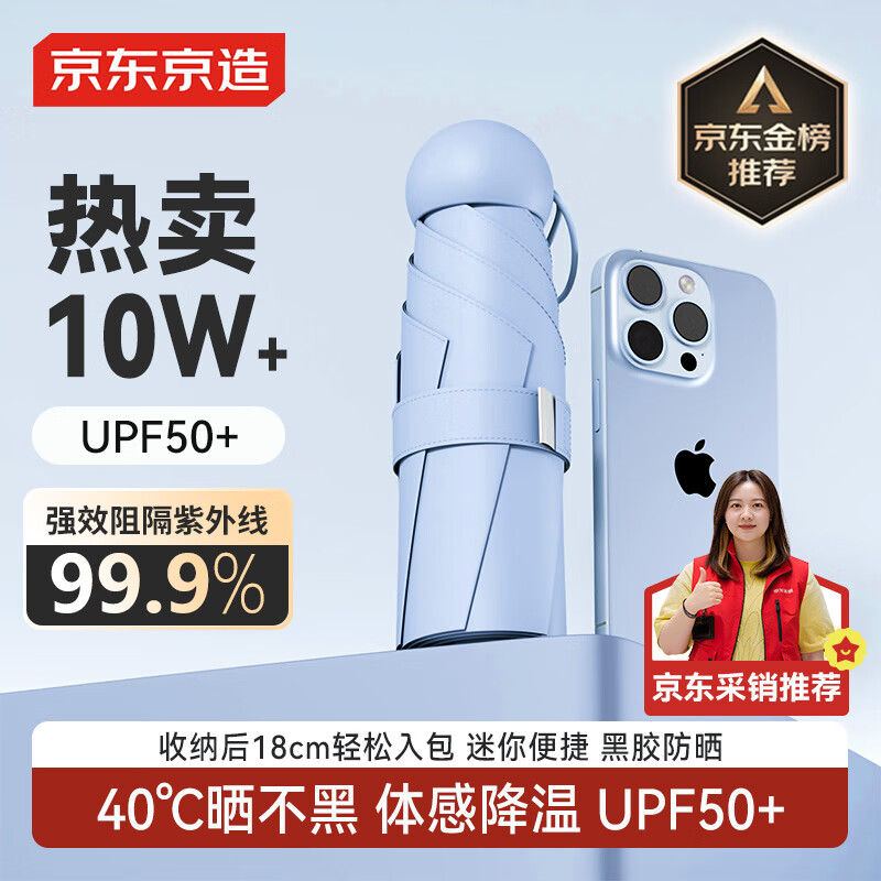 京东京造 小布丁 冰山蓝太阳伞女防紫外线便携五折遮阳伞防晒晴雨折叠伞