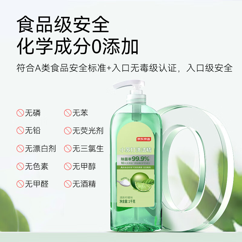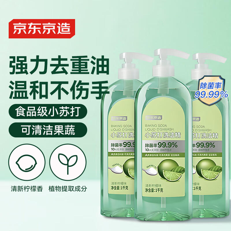 京东京造小苏打洗洁精 1kg*3瓶 食品级不伤手 99.9%除菌 去农残 柠檬祛味