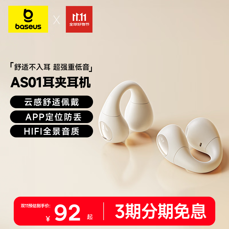 倍思AS01蓝牙耳机耳夹式开放式骨传导概念不入耳运动通话适用苹果华为vivo手机 白