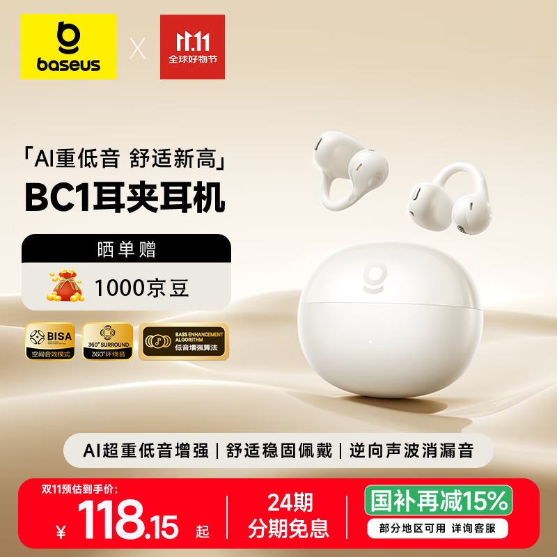倍思BC1蓝牙耳机耳夹式开放式骨传导概念不入耳运动通话适用苹果华为手机