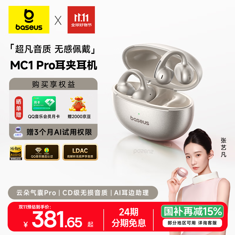 倍思MC1 AI蓝牙耳机耳夹式开放式小云朵骨传导概念不入耳运动通话适用苹果华为手机