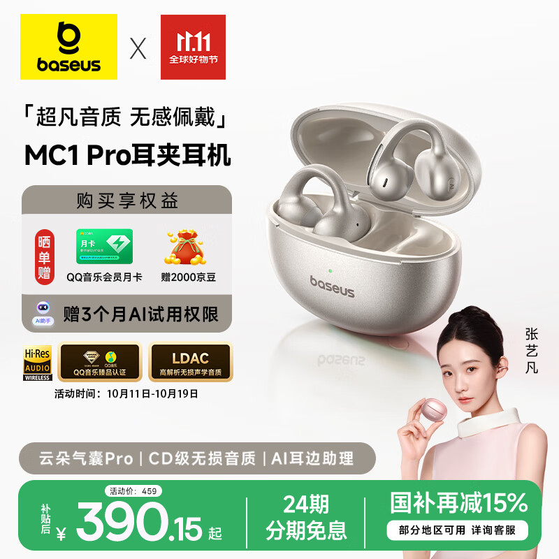 倍思MC1pro AI【明星同款】蓝牙耳机耳夹式开放式不入耳翻译运动通话降噪气骨传导适用华为苹果手机