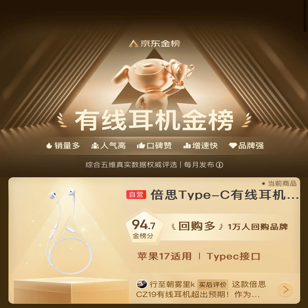 倍思【京东金榜】CZ19半入耳式有线耳机苹果iPhone17/16Pro华为mate70安卓手机电脑游戏type-c线控带麦