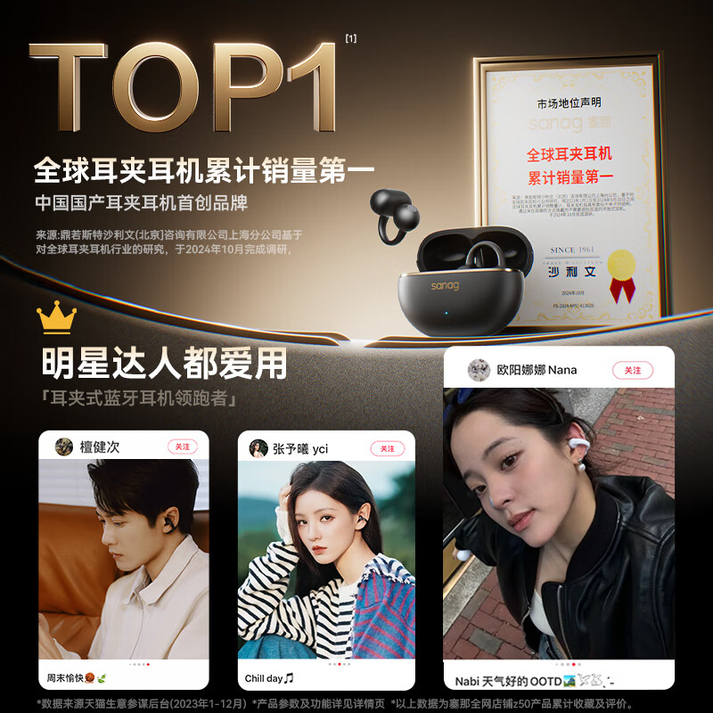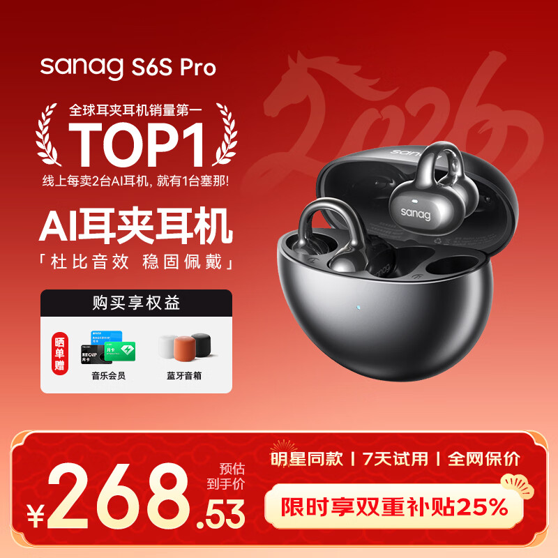 SANAG塞那S6S Pro蓝牙耳机耳夹式无线耳机开放式听力保护运动跑步通话降噪耳夹ai耳机