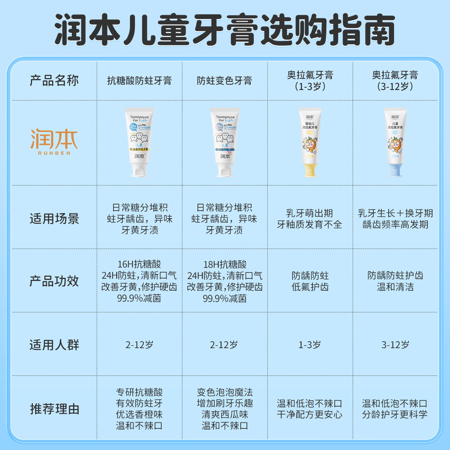 润本儿童牙膏3到6到12岁婴幼儿含氟换牙期防蛀奥拉氟牙膏抗糖酸 【3-12岁】 60g 2支 含氟防蛀儿童牙膏