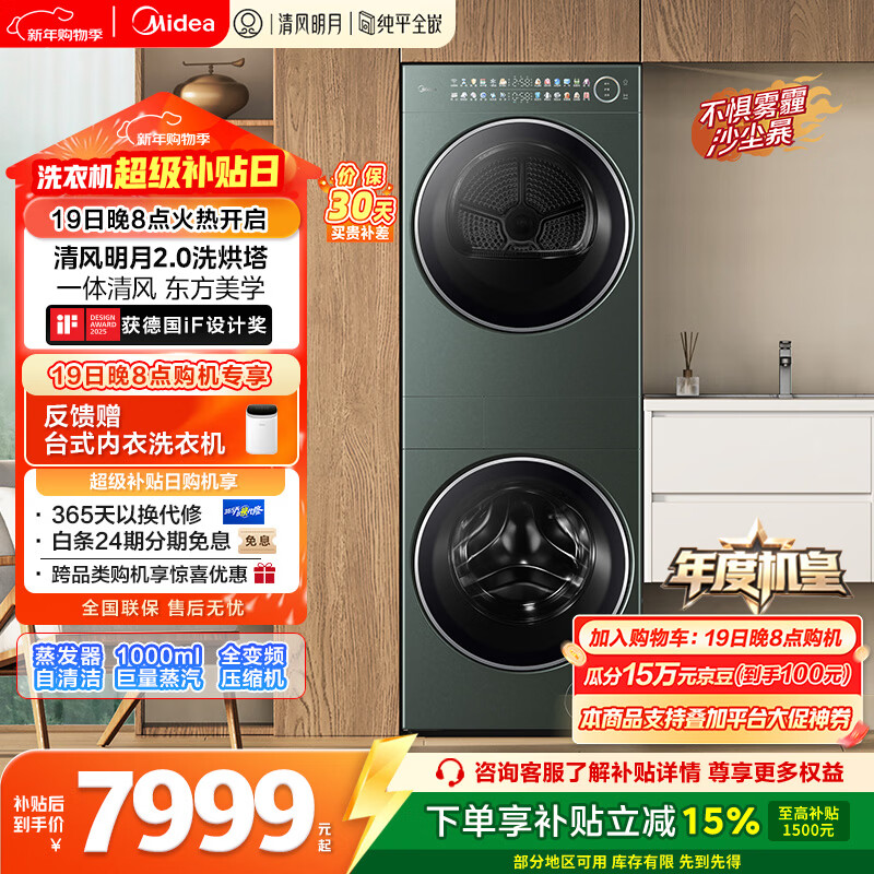 美的(Midea)年度机皇 清风明月2.0洗烘塔 滚筒洗衣机全自动10KG 带烘干洗烘一体 热泵 MGH20A-G+MAX 国家补贴