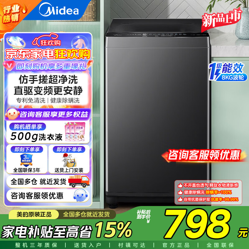 美的(Midea)波轮洗衣机全自动10kg家用大容 量专利免清洗 健康除螨洗不锈钢立方内筒 直驱变频 波轮 8kg MB8V56DT