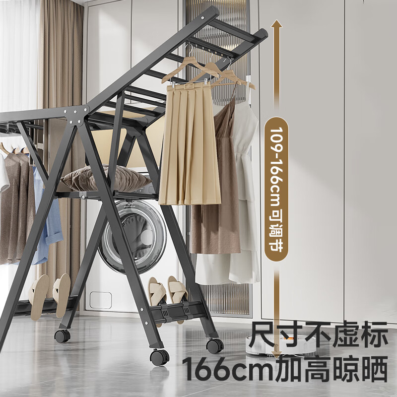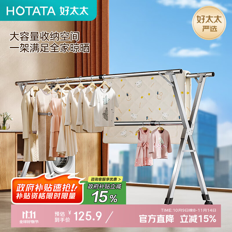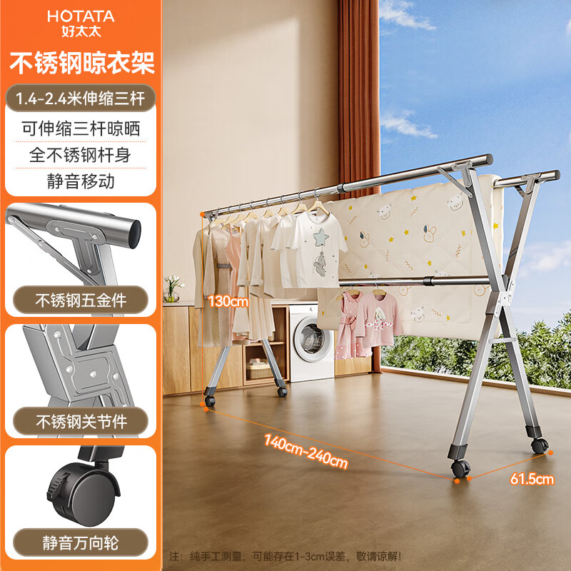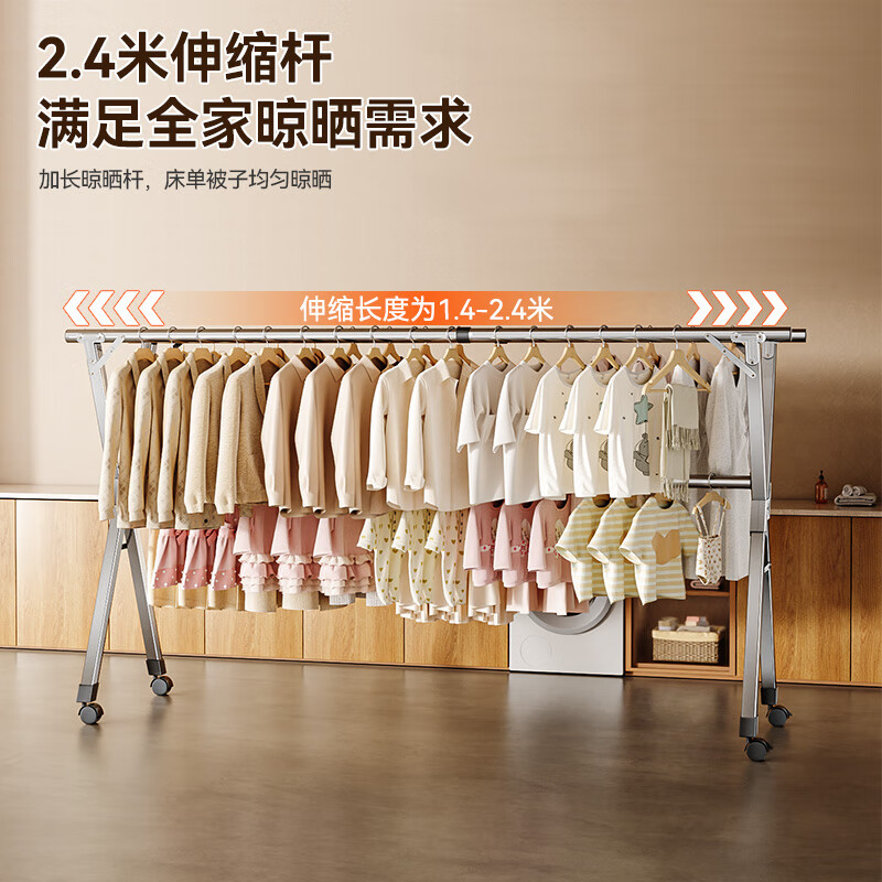 好太太不锈钢X型晾衣架可伸缩折叠晒衣架万向轮可移动室内外晒衣服被子