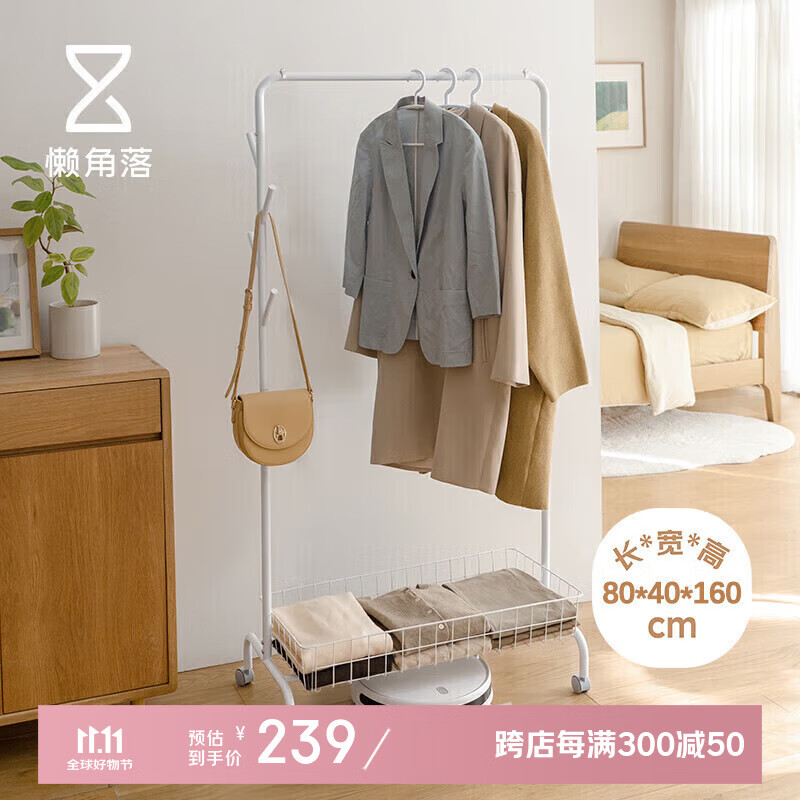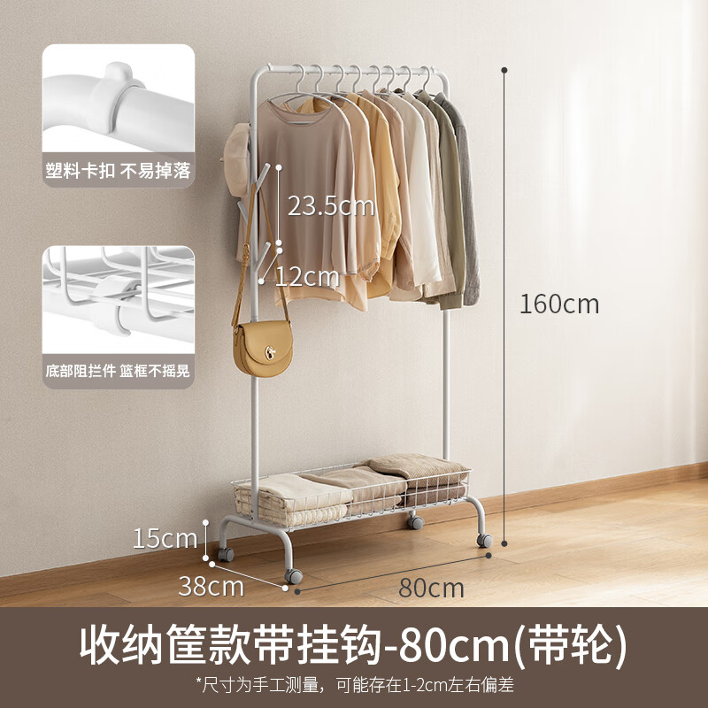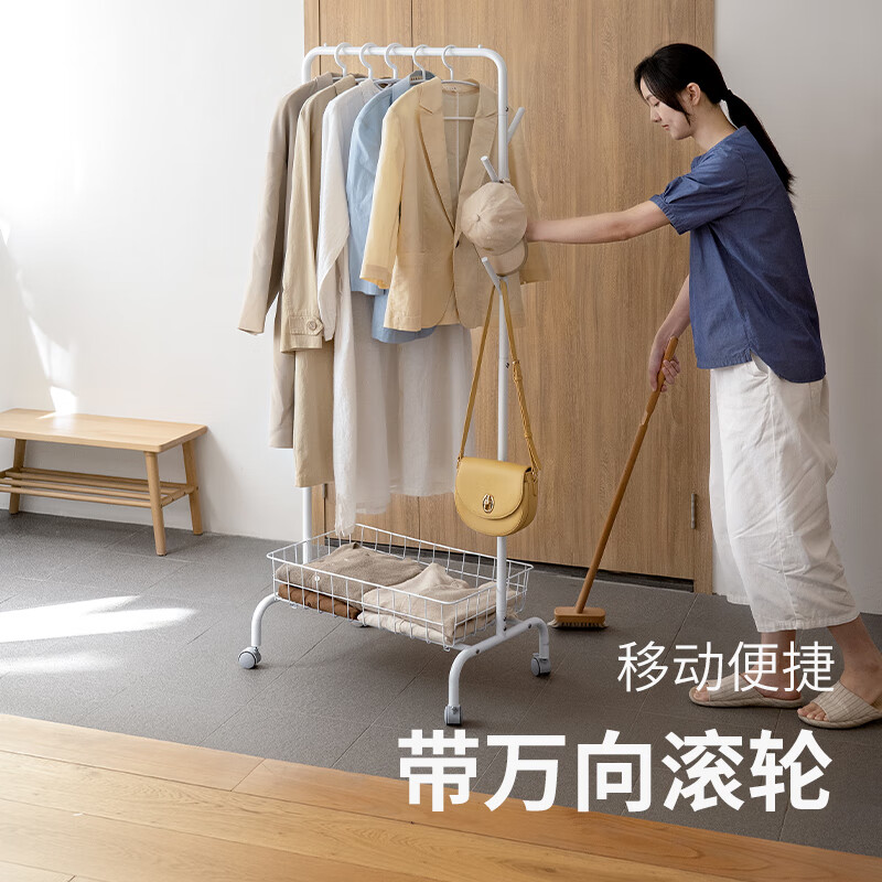 懒角落衣帽架落地衣架卧室金属衣帽架晾晒置物衣架收纳筐款带轮挂钩80cm