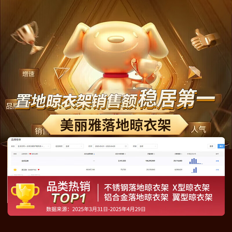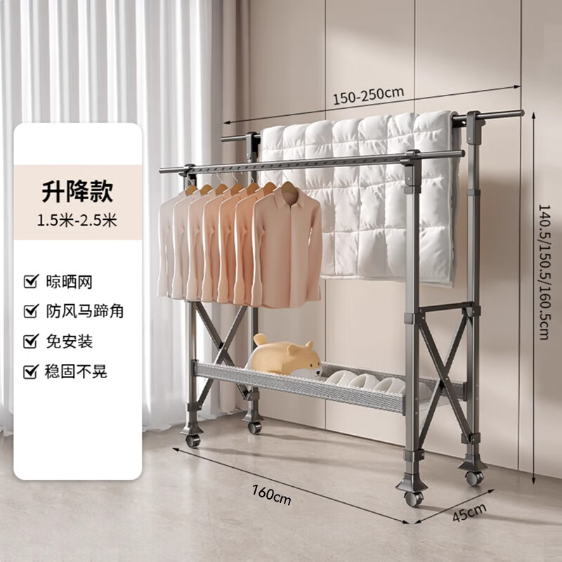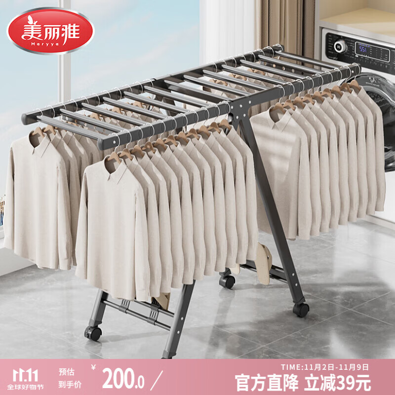 美丽雅晾衣架落地可折叠室内可移动晒衣架家用阳台户外防风挂衣架晒被子