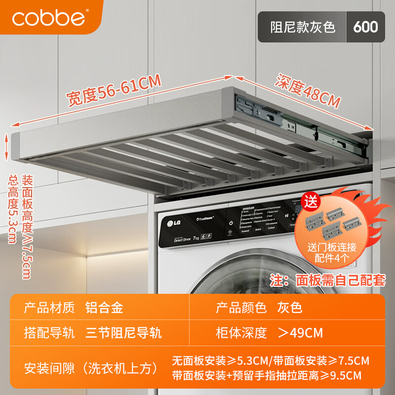卡贝(cobbe)洗衣机隐形晾衣架抽拉式上方可加面板阳台晾衣架阻尼48灰色