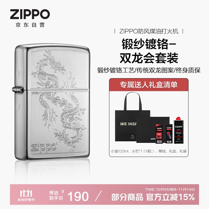 ZIPPO打火机之宝防风煤油 锻纱镀铬-双龙会 生日礼物送男友 含油套装