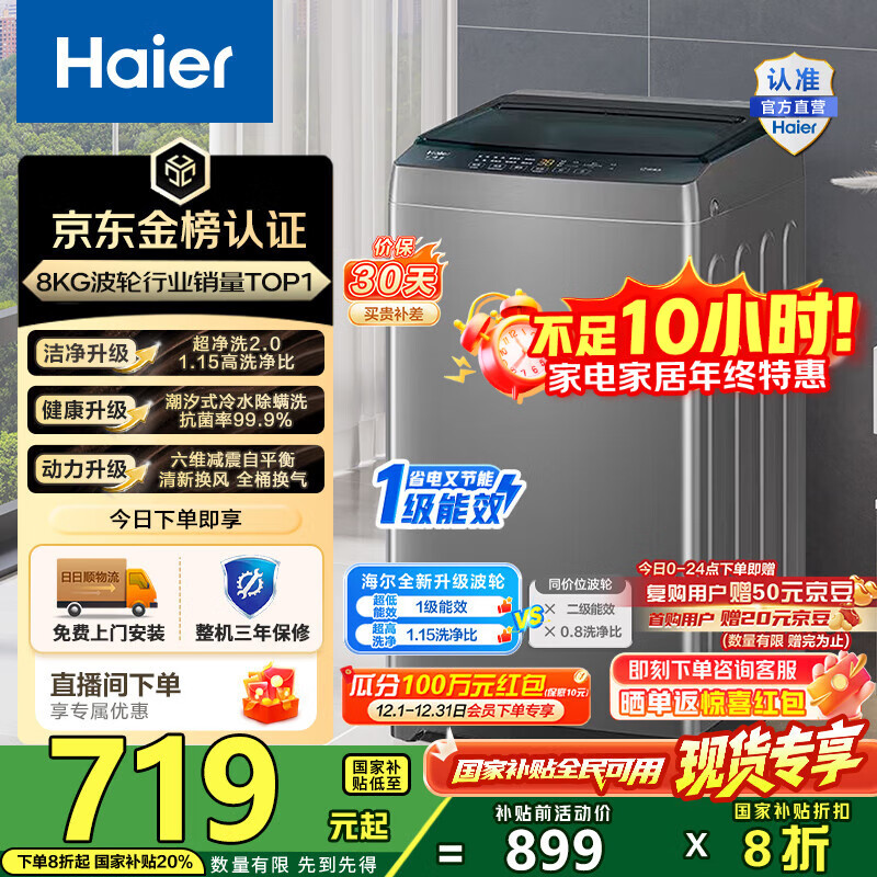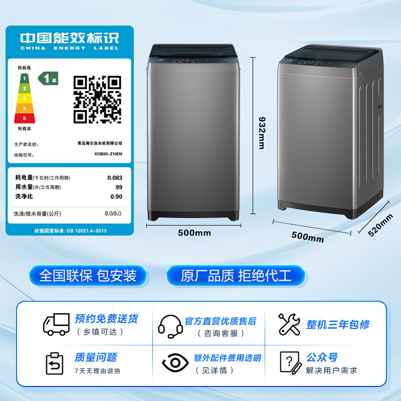 海尔(Haier)波轮洗衣机小型全自动 8KG家用洗脱一体Z10D0 以旧换新一级能效 宿舍出租房单脱水家电国家补贴20% 8KG销冠丨金榜认证丨超净洗