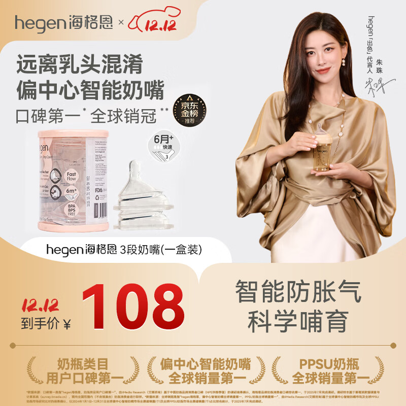 HEGEN海格恩奶嘴婴儿偏中心奶嘴设计超软硅胶防胀气3段奶嘴6月+2个装