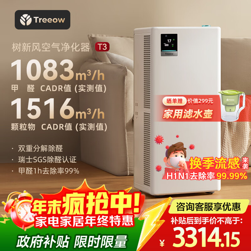 树新风空气净化器除甲醛猫毛TVOC异味除菌除过敏认证家用大空间全效净化器T3【家电国家补贴】