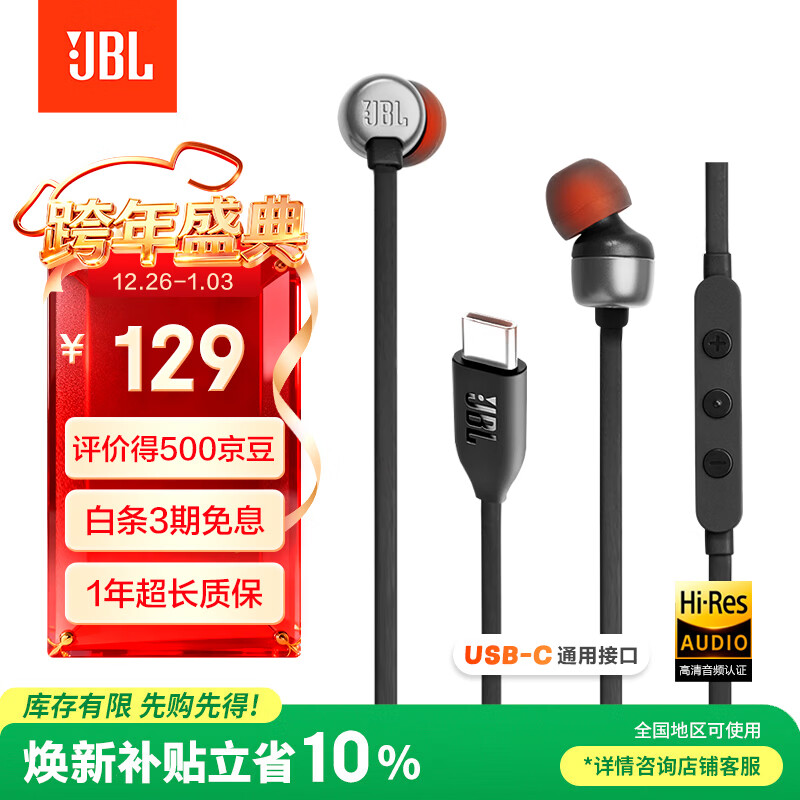 JBLTUNE310C有线耳机Type-C接口入耳式耳机 电脑耳机 适用于USB-c设备黑色生日元旦新年礼物