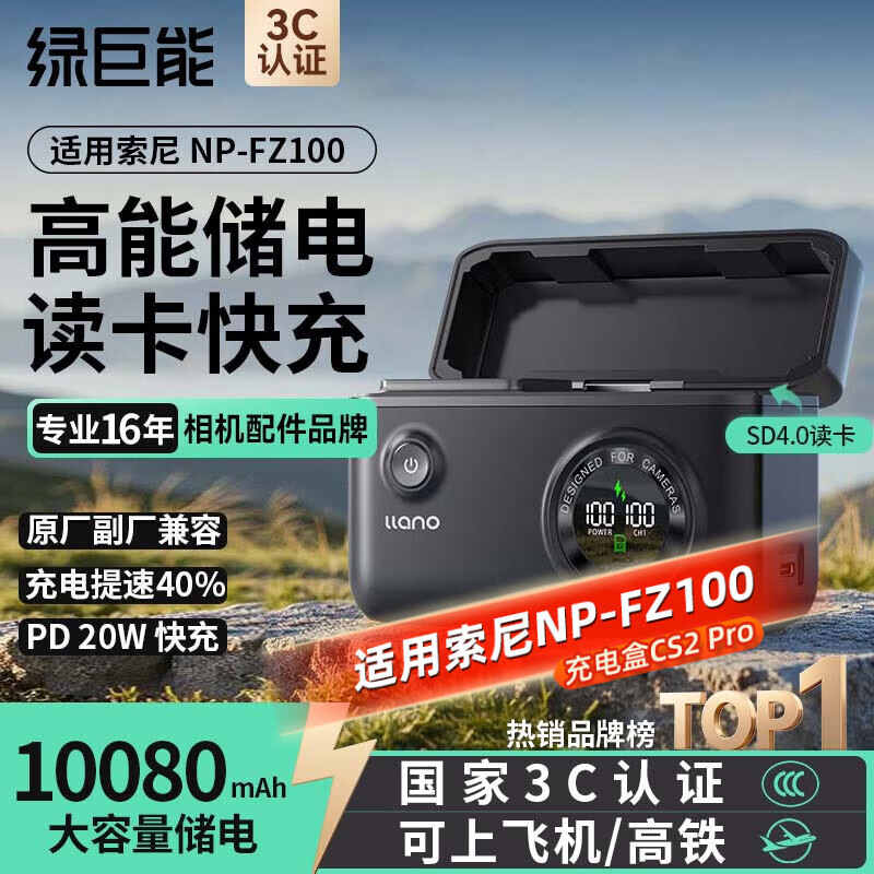 绿巨能(llano)充电盒CS2Pro适用索尼a7m4/a7c2相机FZ100电池充电器a7m3/a7r3/a7r5/a6700/zve10II/a7m5/a9快充盒