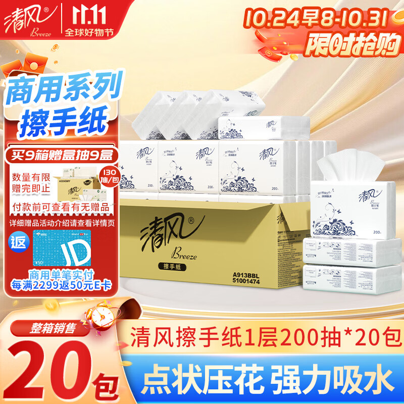 清风擦手纸1层200抽*20包商用抽取式吸油纸酒店加厚洗手间干手A913BBL