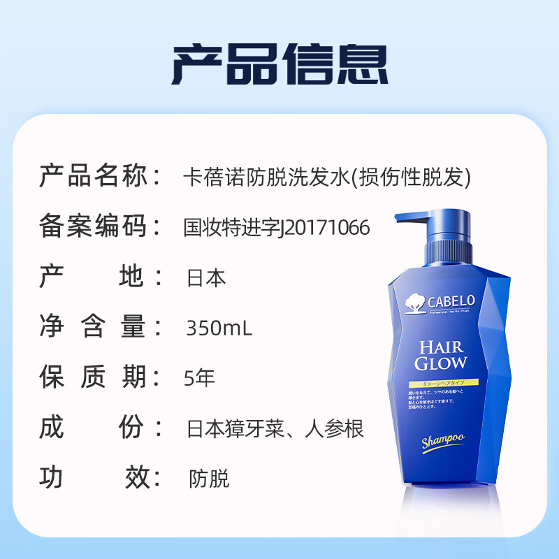 卡蓓诺(CABELO)防脱洗发水损伤性脱发修护受损烫染干枯发质适用【日本原装进口】 损伤型防脱小蓝钻洗发水 350ml*1