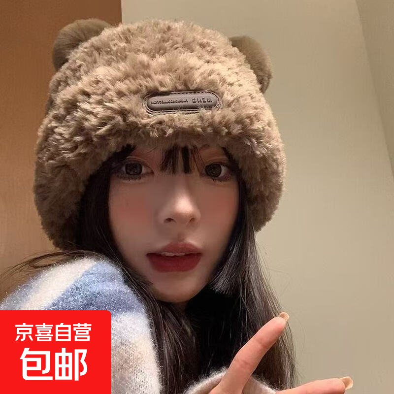 2025年秋冬潮可爱毛毛小熊保暖套头帽子女网红护耳防寒针织毛线帽 皮标小熊咖啡色 均码