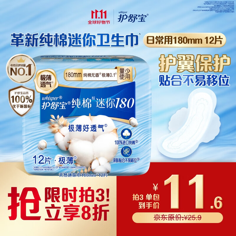 护舒宝天然纯棉迷你卫生巾量少日用180mm12片姨妈巾京东自营官方旗舰