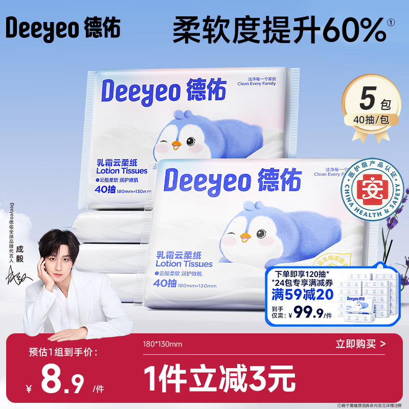 德佑婴儿云柔巾保湿纸巾乳霜纸40抽5包儿童超柔软抽纸便携装