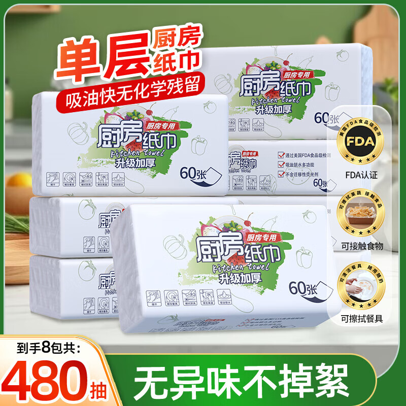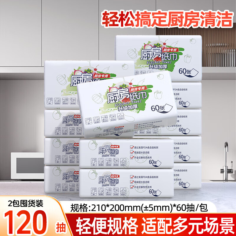 FDA食品级厨房抽纸用纸厚实吸油吸水去污一次性抹布抽取式60抽 食品级厨房用纸 1层 60抽*1包