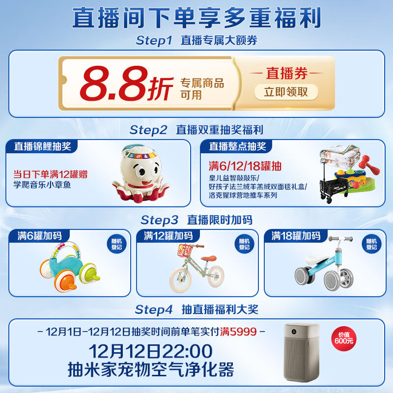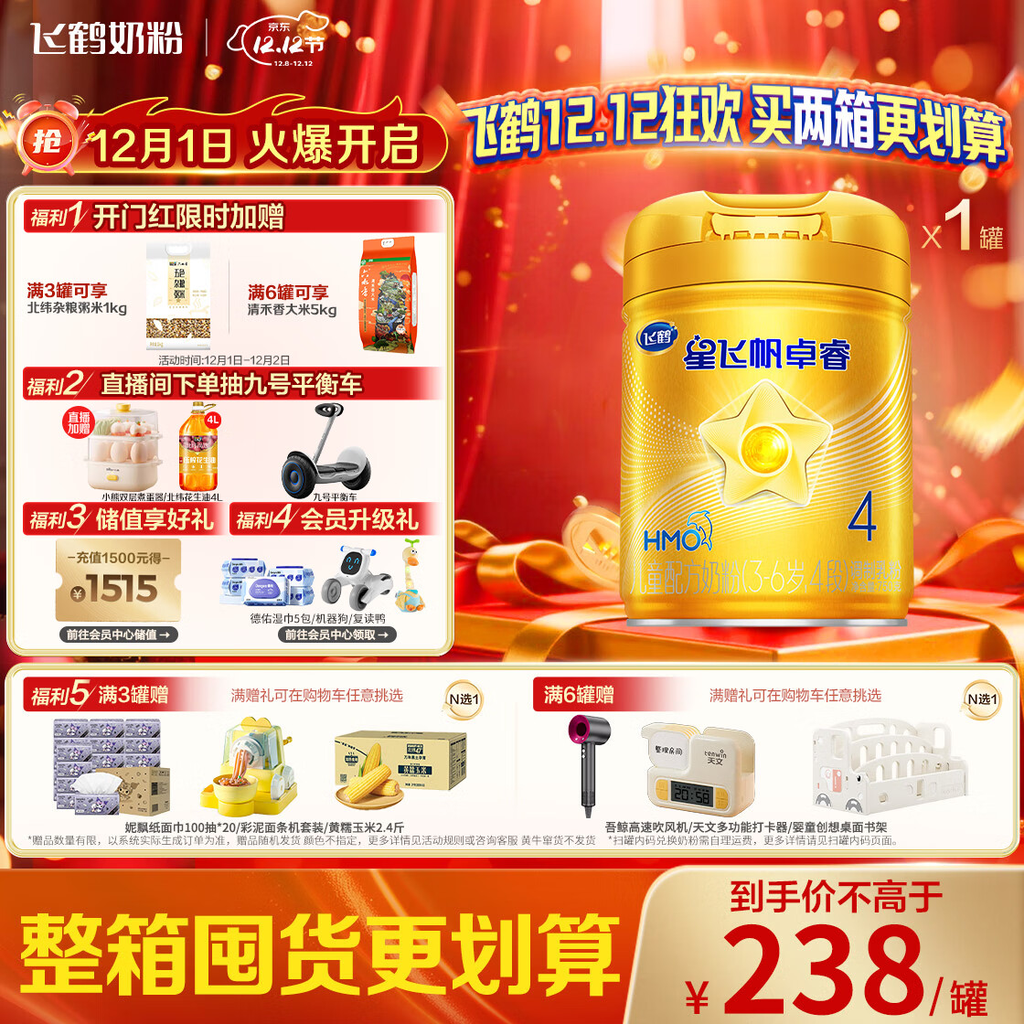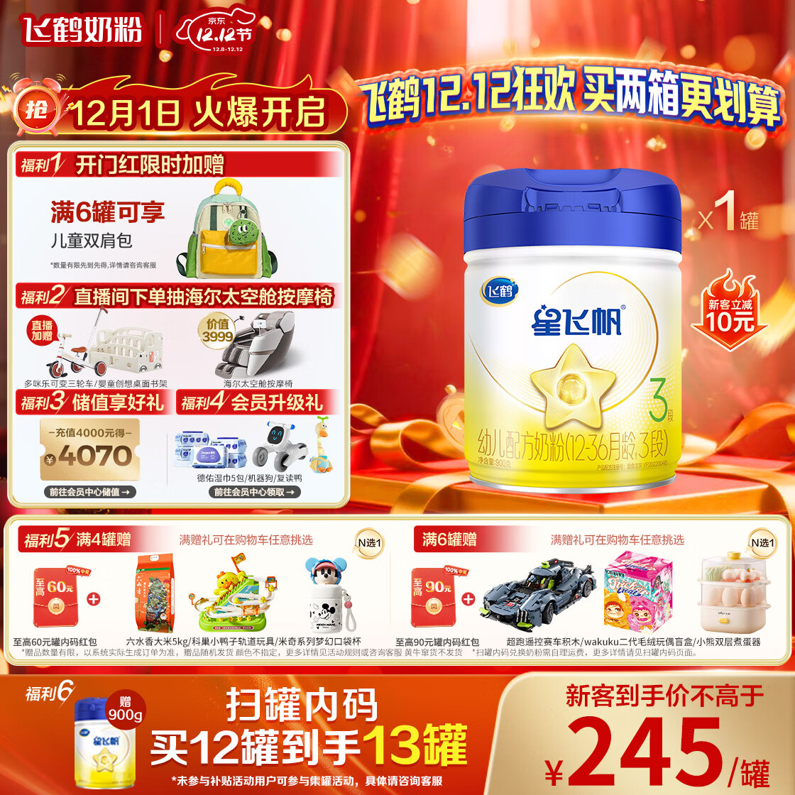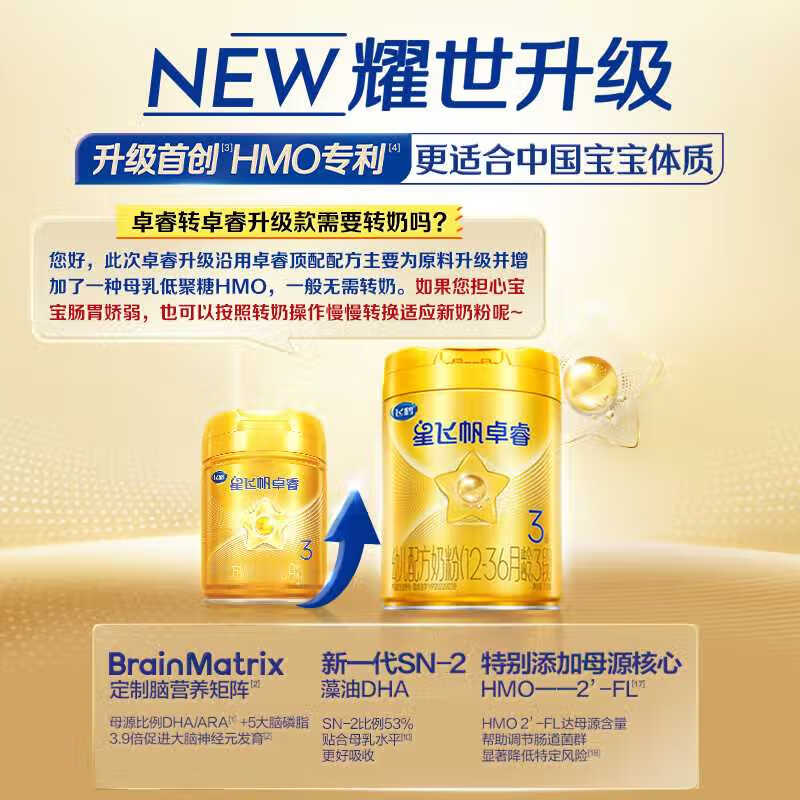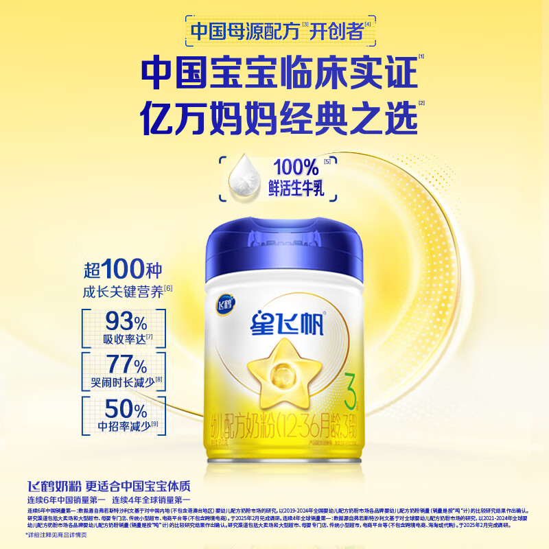 飞鹤星飞帆卓睿Pro A2β酪蛋白3段(1-3岁)幼儿配方奶粉758g*6老爸抽检