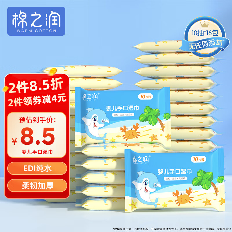 棉之润婴儿手口湿巾小包便携学生儿童专用湿纸巾10抽*16包随身出行装