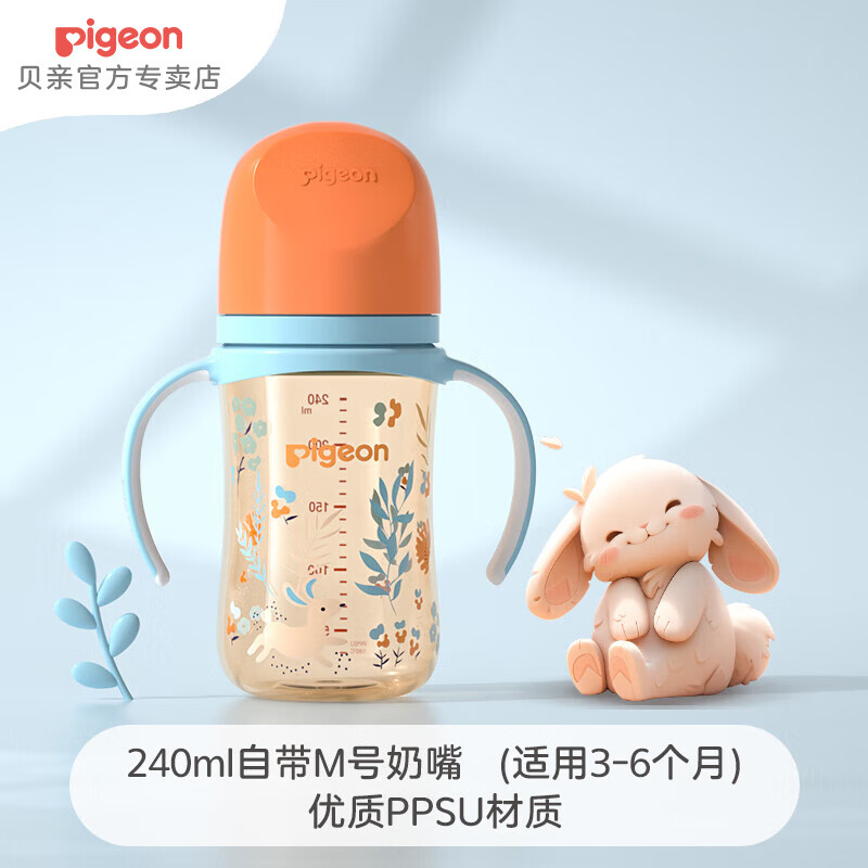 贝亲奶瓶ppsu 防胀气奶瓶 婴儿奶瓶双把手宽口径彩绘宝宝喝奶瓶大容量 丛林小兔 240ml 3-6月 自带M奶嘴