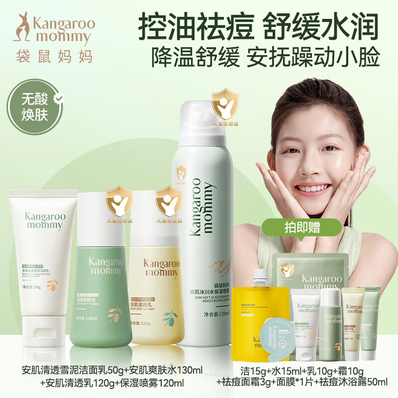 袋鼠妈妈青少年护肤品洗面奶控油祛痘舒缓清爽水乳霜青春期补水保湿套装 【补水盈润】洁面+水+乳+喷雾