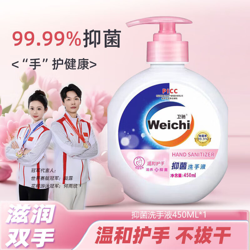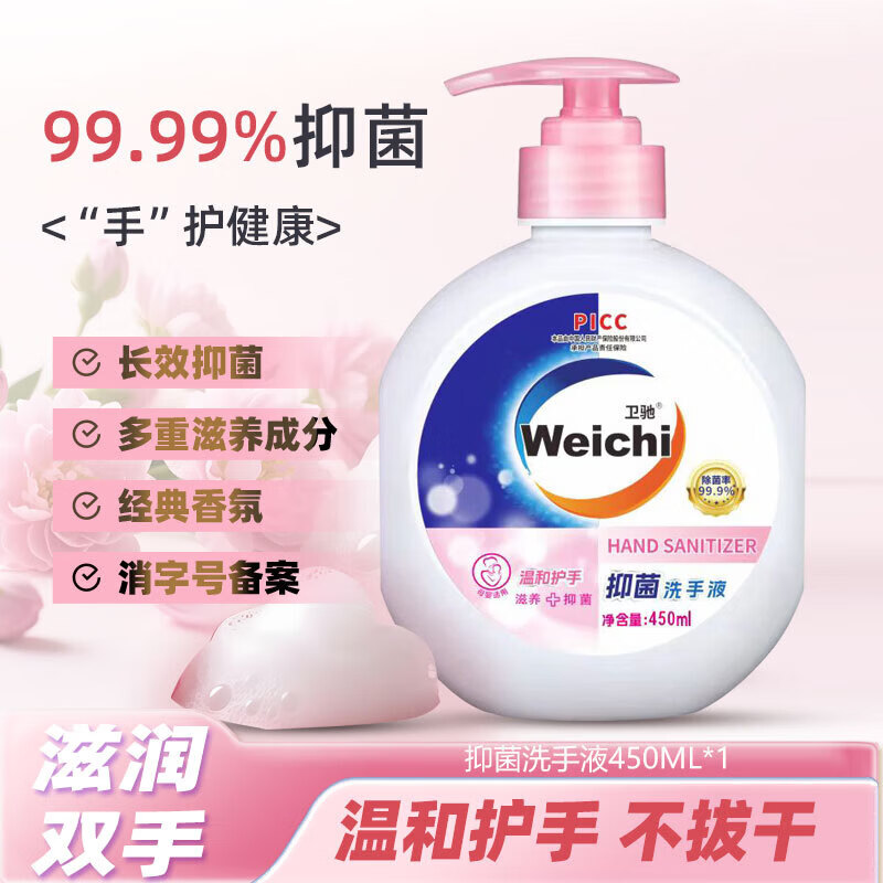 【推荐】卫驰温和滋润抑菌洗手液持久清香按压式温和清洁母婴家用 450g*1瓶+1个按压泵头【体验装】