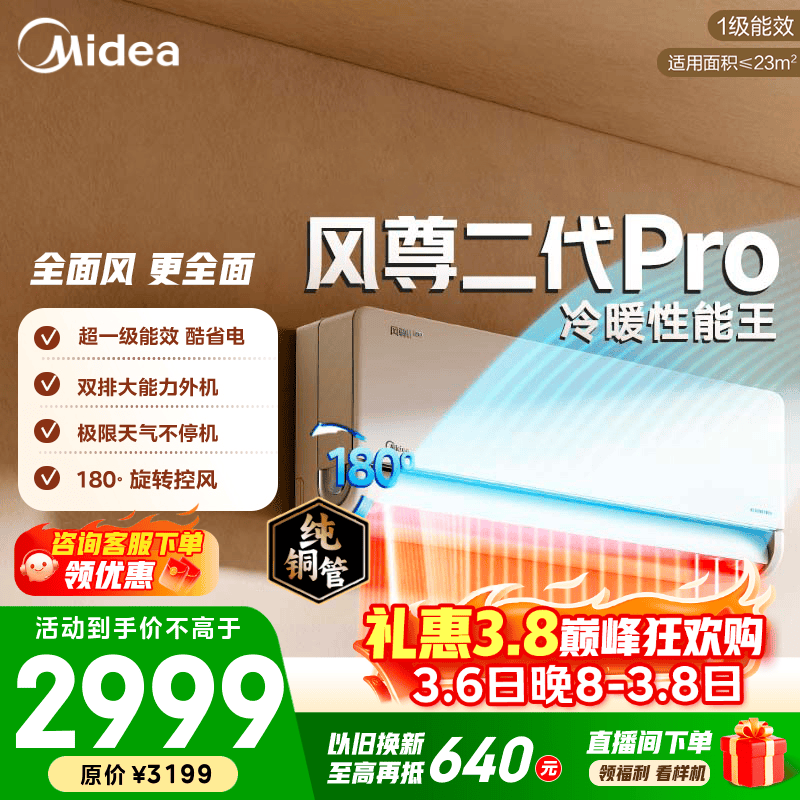 美的空调 大1匹/1.5匹 风尊二代 超一级能效变频冷暖 全面风舒适省电 卧室空调挂机 国家补贴 以旧换新 风尊二代Pro 大1.5匹 双排外机制热