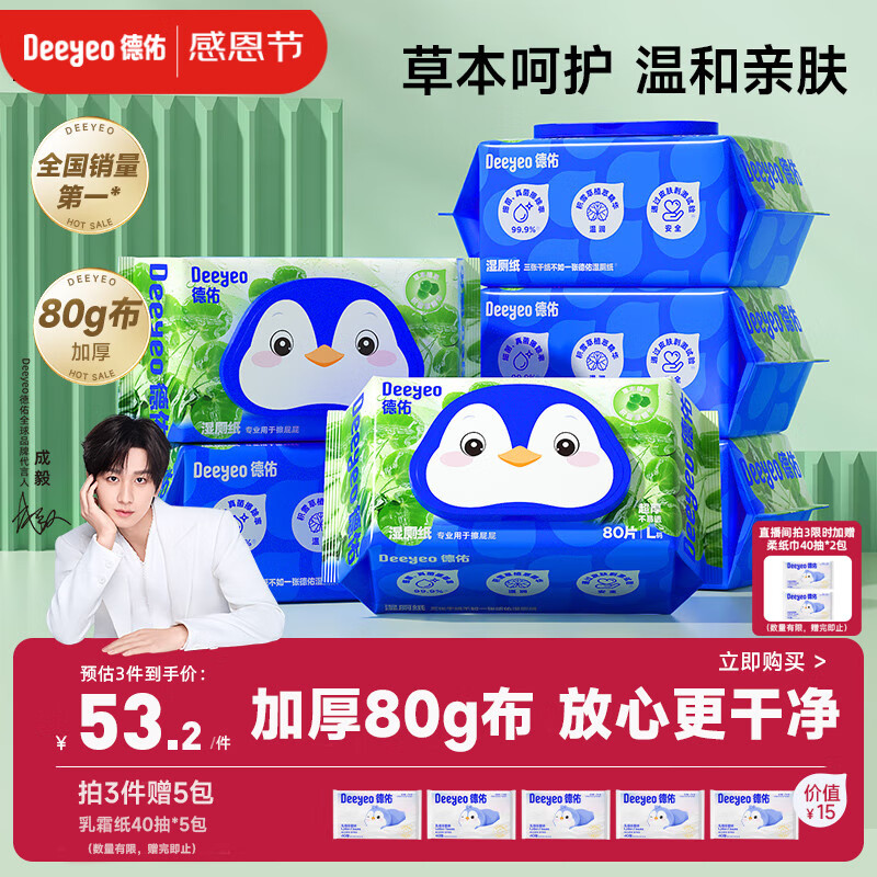 德佑积雪草湿厕纸80抽*6包洁厕湿纸巾厕纸弱酸草本呵护擦屁屁柔厚升级