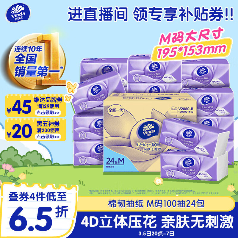 维达(Vinda)【孙颖莎推荐】抽纸 棉韧3层100抽*24包M码 餐巾纸纸抽 纸巾 整箱