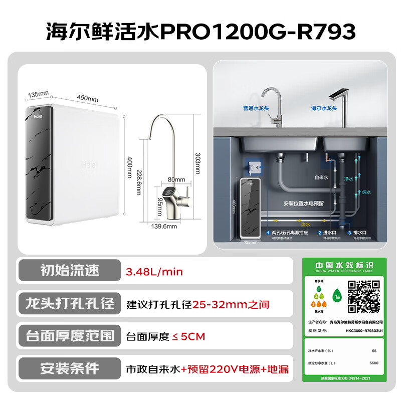 海尔(Haier)鲜活水pro净水器1200G6年RO膜政府补贴净饮机家用厨房专用台下用反渗透过滤直饮净水机