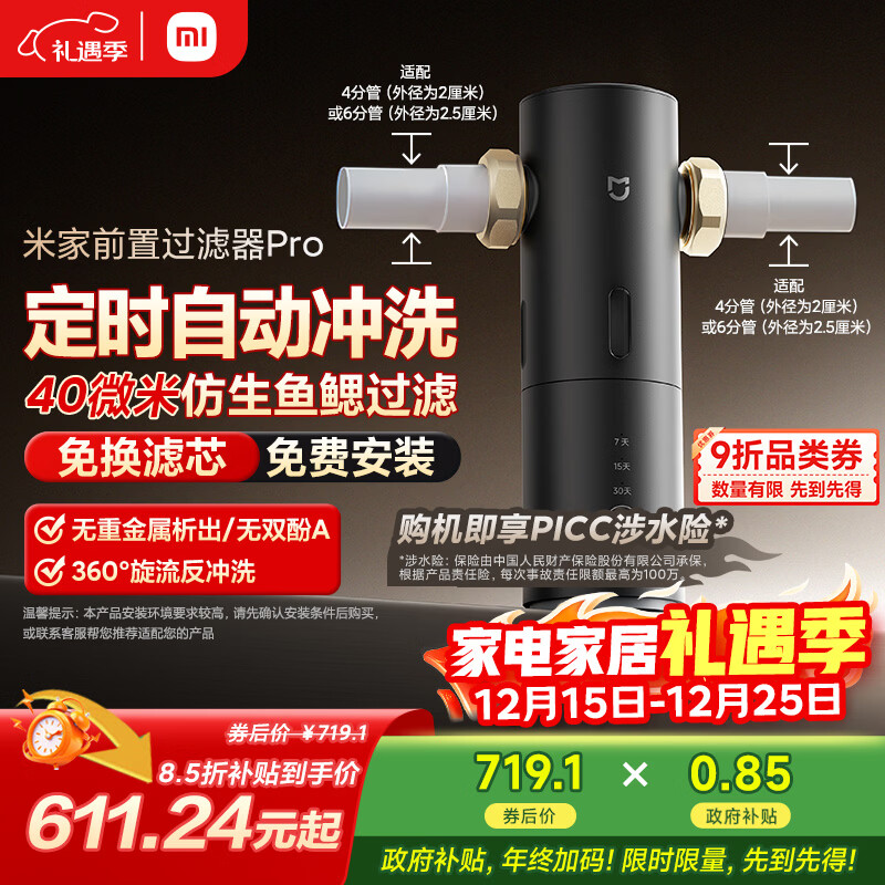 米家前置过滤器 Pro 定时自动冲洗40 微米仿生鱼鳃叠片过滤360°旋流反冲洗MJQZGLQZLDB